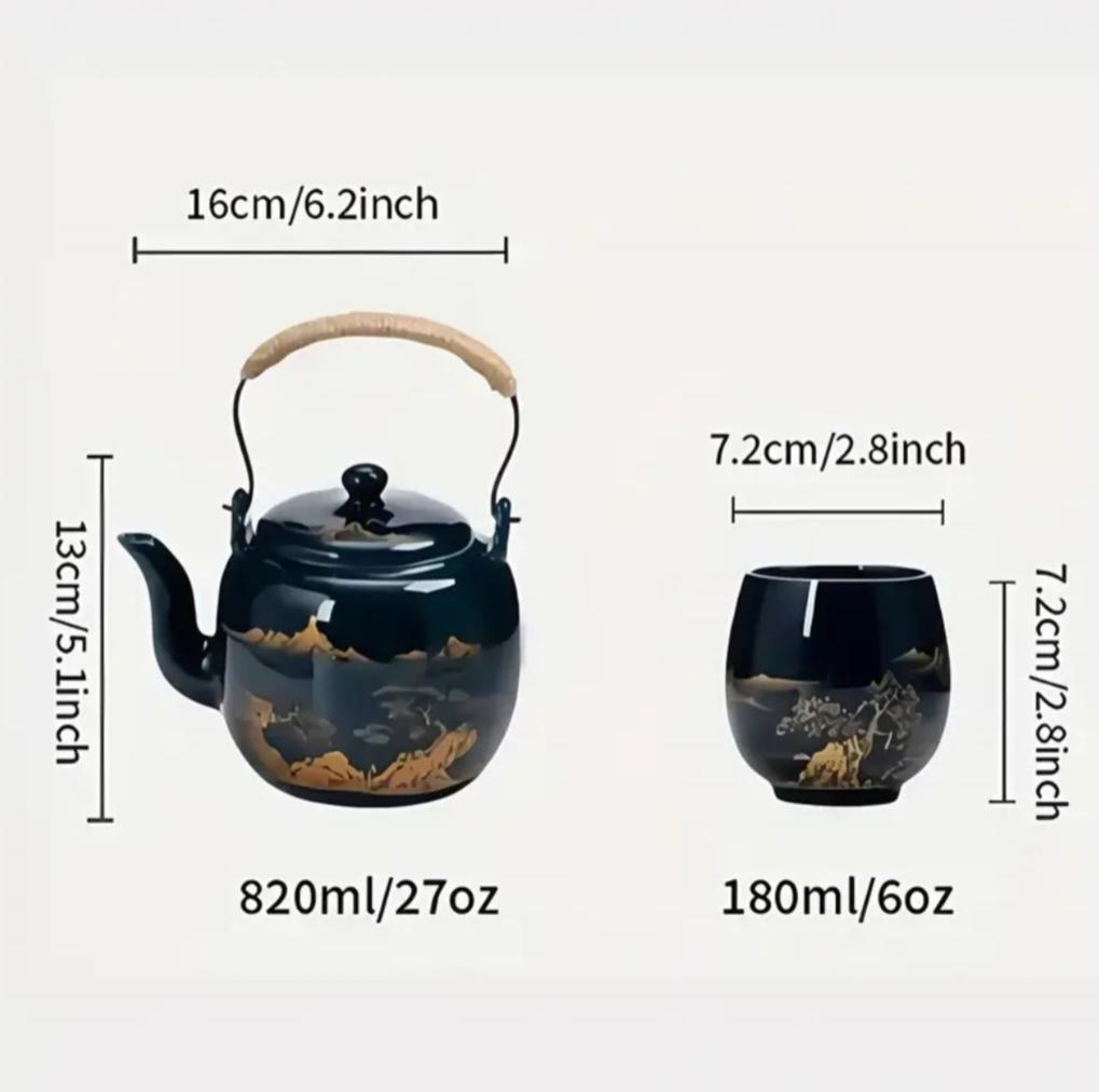 Descubre la elegancia del ritual del té con este refinado set japonés de cerámica. Su acabado en negro brillante, decorado con delicados paisajes dorados, aporta un aire sofisticado y atemporal a tu mesa.