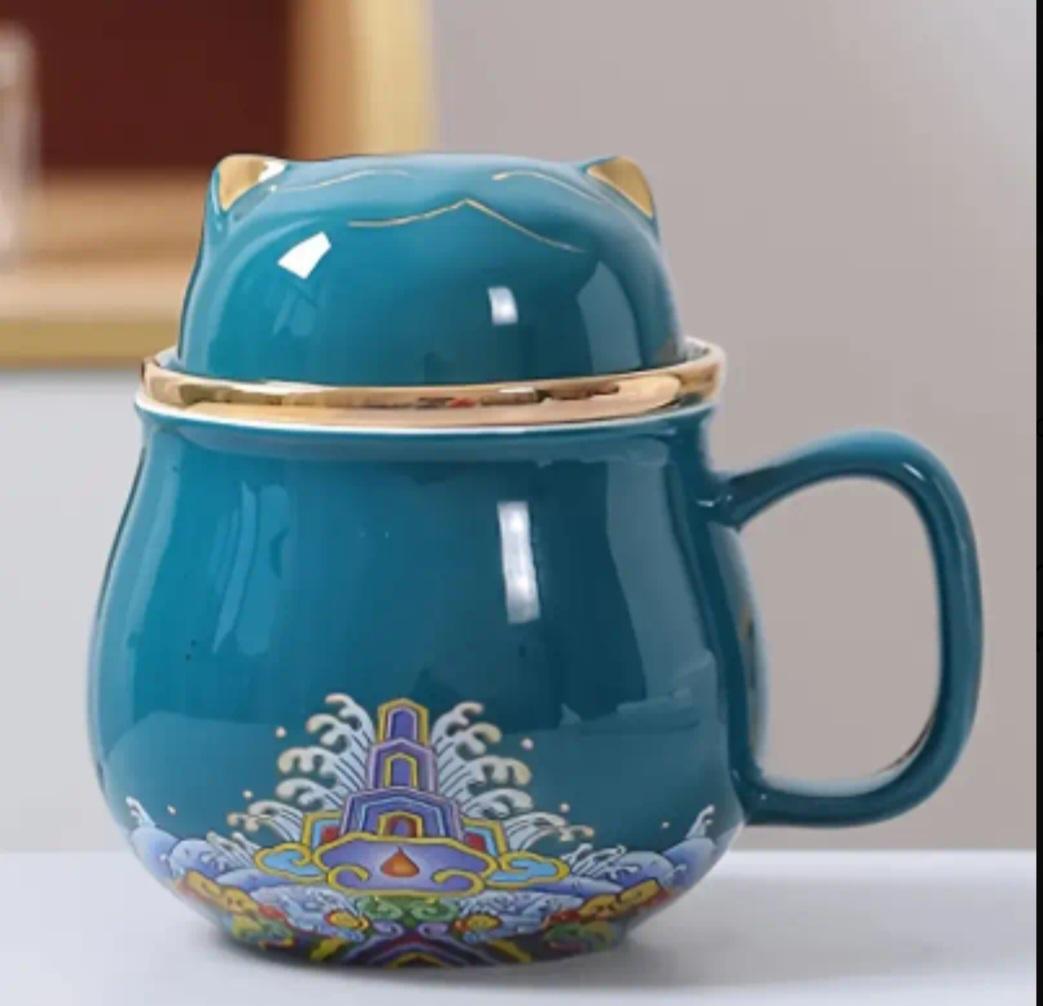 Taza–Tetera de Cerámica “Gato Azul Real” con Infusor y Estuche de Viaje