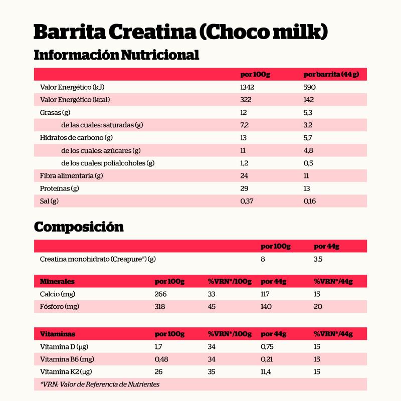 Ingredientes: Proteínas de la leche, jarabe de oligofructosa, cobertura de chocolate con leche [azúcar, manteca de cacao, leche desnatada en polvo, pasta de cacao, lactosuero en polvo (leche), materia grasa láctea (leche), leche entera en polvo, emulgente (lecitina de soja), aroma natural de vainilla, aroma], jarabe de polidextrosa, creatina monohidrato (Creapure®), manteca de cacao, cacao desgrasado en polvo (1,7 %), humectante (jarabe de sorbitol), celulosa microcristalina, fosfato dicálcico (fósforo, calcio), aromas (contiene leche), potenciador del sabor (cloruro potásico), vitaminas [colecalciferol (vitamina D), clorhidrato de piridoxina (vitamina B6), menaquinona (vitamina K2)].