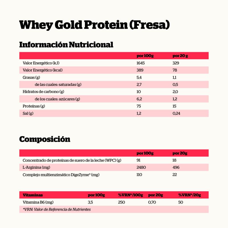 Ingredientes: Concentrado de proteínas de suero de la leche (Whey Protein Concentrate) (91%), fresa deshidratada en polvo (4,2 %), L-arginina clorhidrato, aromas (contienen leche), sal, edulcorantes (acesulfamo potásico, sucralosa), complejo multienzimático DigeZyme® (0,11%)[alfaamilasa (Aspergillus oryzae), proteasa (Bacillus subtilis), lactasa (Aspergillus oryzae), lipasa (Rhizopus oryzae), celulasa (Trichoderma longibrachiatum), maltodextrina], colorante (E-120), clorhidrato de piridoxina (vitamina B6).