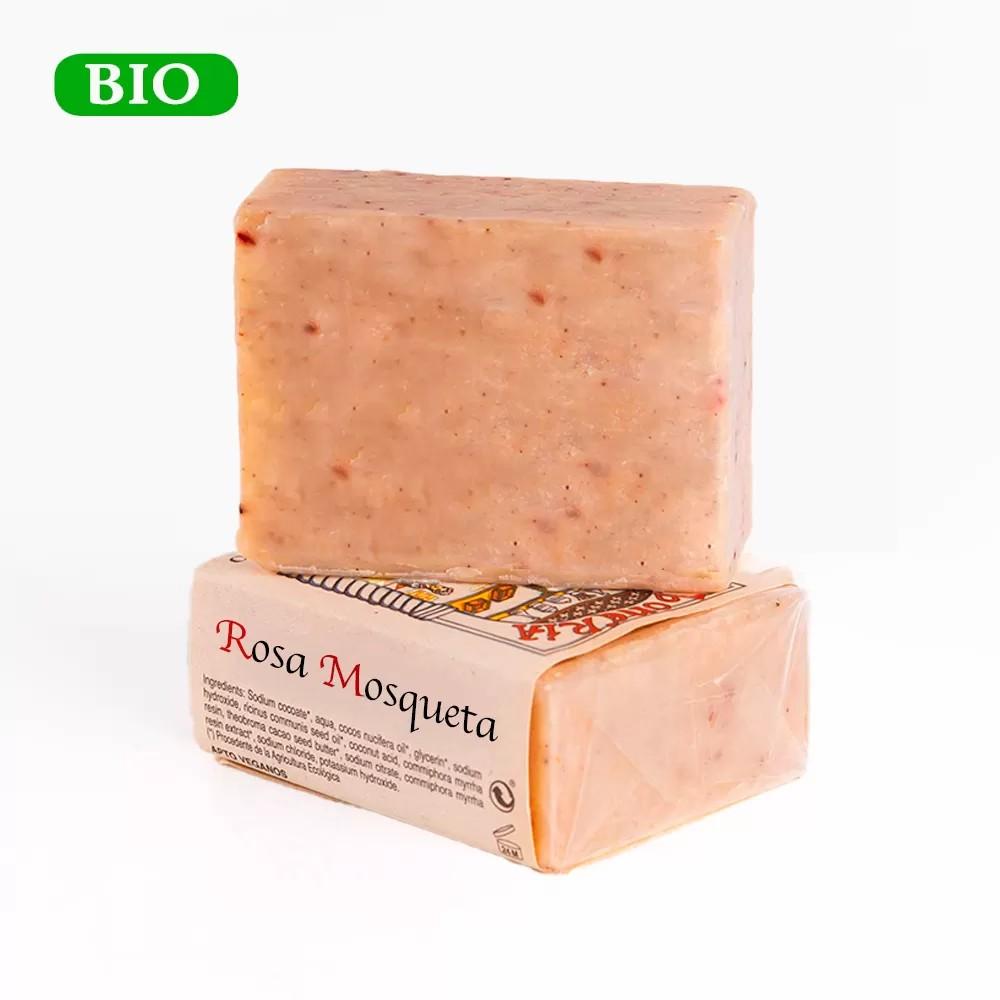 Jabón ecológico elaborado con Aceite de Rosa Mosqueta. Las potentes propiedades regeneradoras e hidratantes del aceite de Rosa Mosqueta, y su gran riqueza en ácidos grasos esenciales, en tocoferoles naturales, etc., hacen de este aceite una gran herramienta para regenerar y nutrir las pieles secas o agredidas ayudando a la eliminación de manchas, estrías y cicatrices.